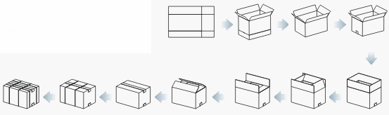 自动折盖封底、自动折盖封箱、自动输送、对包装物 90 °转向、自动完成“ # ”字形多道捆扎。