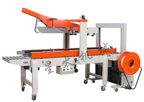 该全自动折盖封箱打包机由XHC-50自动折盖封箱机和自动捆扎机组成,采用先进技术制造,并选用进口零部件,电器零件及气动元件,功能集自动折盖、封箱及捆扎为一体,具有连续自动折盖、上下封箱、多道捆扎包装功能;实现封箱捆扎自动化、节省生产成本。具有自动停线、自动唤醒功能。可通过简单方便的调整实现纸箱规格的变换,本机可通过旋转按钮来控制打一道或者两道,自动化程度高、效率更高。